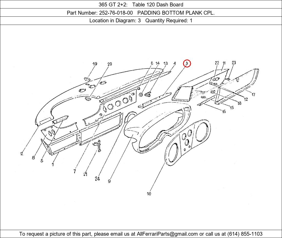 Ferrari Part Number 252-76-018-00, PADDING BOTTOM PLANK CPL. shown here as used in 365 GT 2+2 Table 120 Dash Board. Location in Diagram: 3. Required Quantity: 1. This Ferrari part is used in more than one diagram. Click on the diagrams below to see alternative uses of this part: