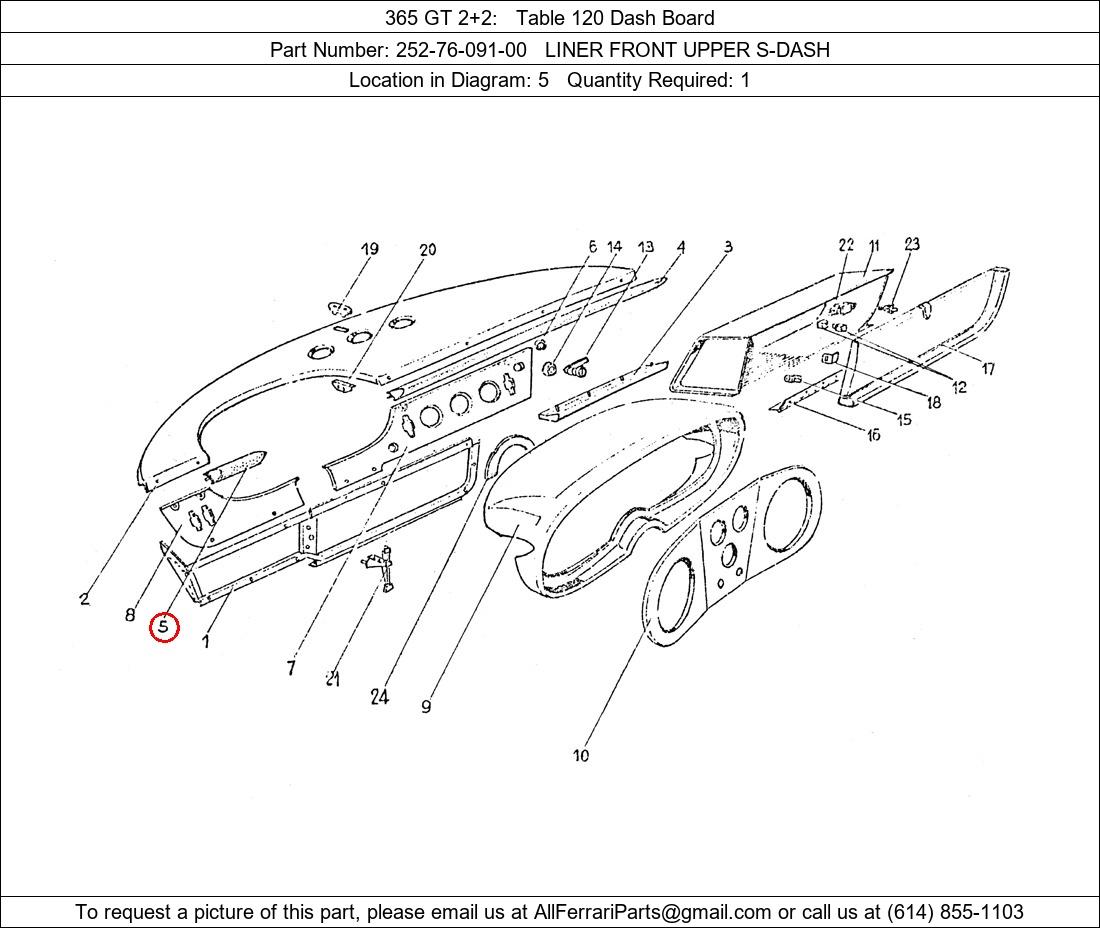 Ferrari Part Number 252-76-091-00, LINER FRONT UPPER S-DASH shown here as used in 365 GT 2+2 Table 120 Dash Board. Location in Diagram: 5. Required Quantity: 1. This Ferrari part is used in more than one diagram. Click on the diagrams below to see alternative uses of this part: