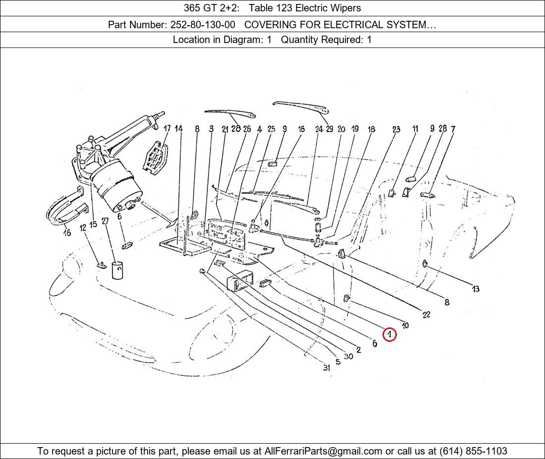 Ferrari Part Number 252-80-130-00, COVERING FOR ELECTRICAL SYSTEM… shown here as used in 365 GT 2+2 Table 123 Electric Wipers. Location in Diagram: 1. Required Quantity: 1