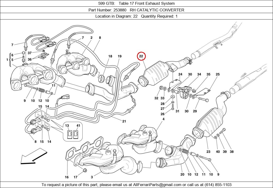 Ferrari Part Number 253880, RH CATALYTIC CONVERTER shown here as used in 599 GTB Table 17 Front Exhaust System. Location in Diagram: 22. Required Quantity: 1
