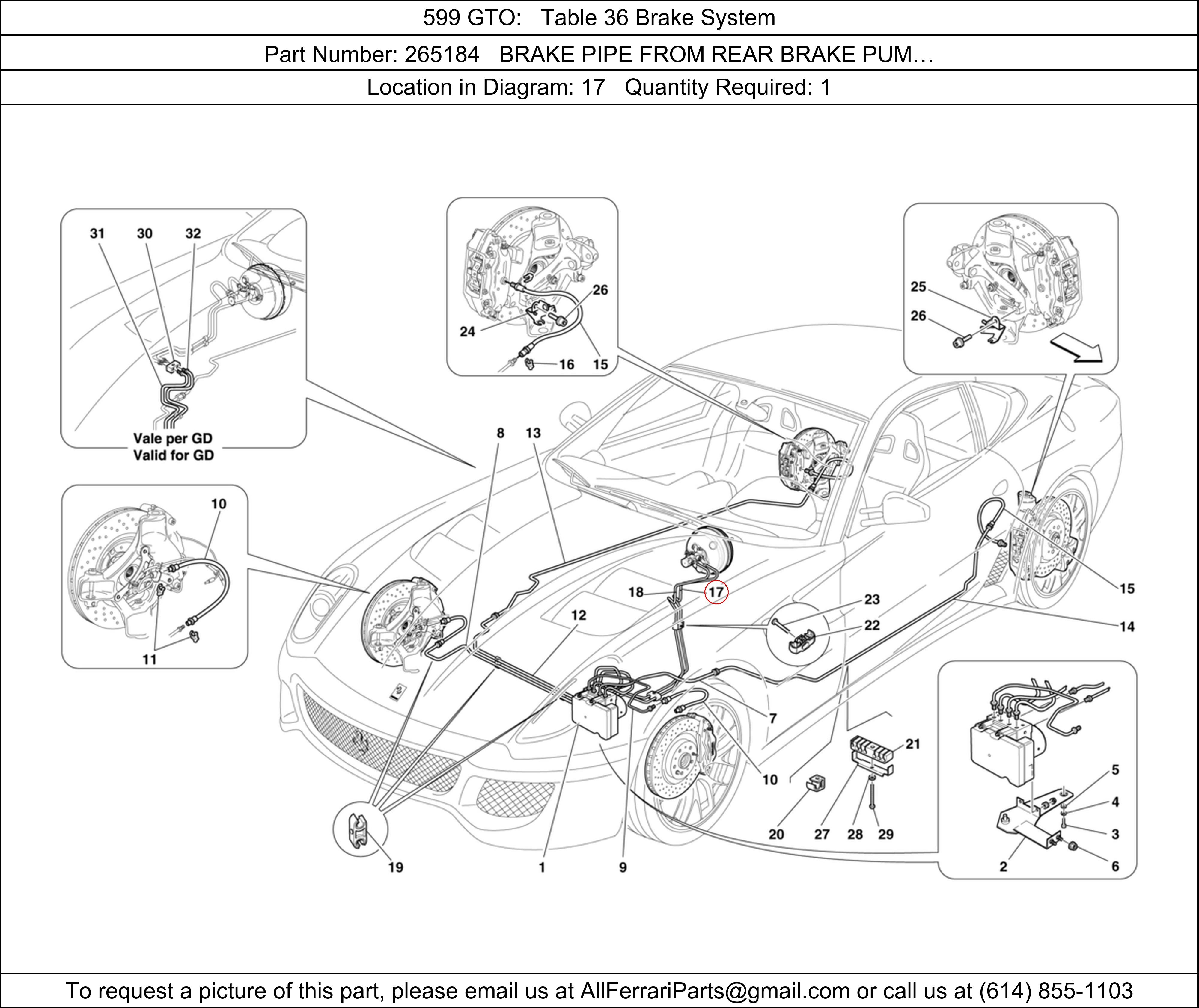 Ferrari Part Number 265184, BRAKE PIPE FROM REAR BRAKE PUM… shown here as used in 599 GTO Table 36 Brake System. Location in Diagram: 17. Required Quantity: 1. This Ferrari part is used in more than one diagram. Click on the diagrams below to see alternative uses of this part: