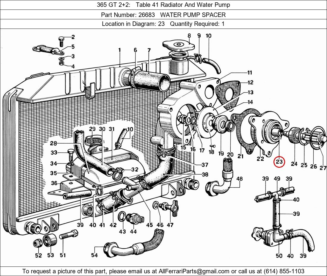 Ferrari Part Number 26683, WATER PUMP SPACER shown here as used in 365 GT 2+2 Table 41 Radiator And Water Pump. Location in Diagram: 23. Required Quantity: 1. This Ferrari part is used in more than one diagram. Click on the diagrams below to see alternative uses of this part: