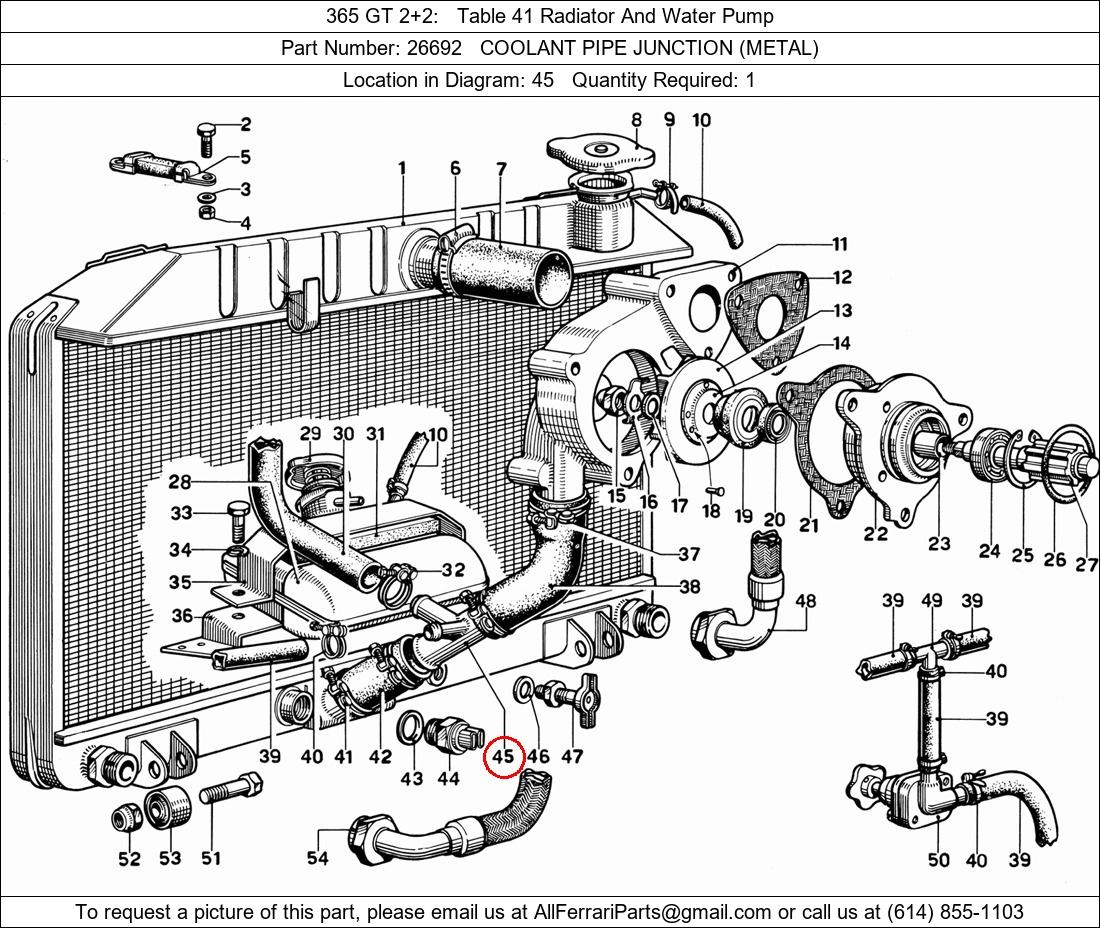 Ferrari Part Number 26692, COOLANT PIPE JUNCTION (METAL) shown here as used in 365 GT 2+2 Table 41 Radiator And Water Pump. Location in Diagram: 45. Required Quantity: 1
