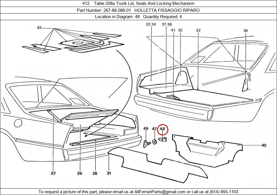 Ferrari Part Number 267-88-086-01, HOLLETTA FISSAGGIO RIPARO shown here as used in 412 Table 208a Trunk Lid, Seals And Locking Mechanism. Location in Diagram: 48. Required Quantity: 4. This Ferrari part is used in more than one diagram. Click on the diagrams below to see alternative uses of this part: