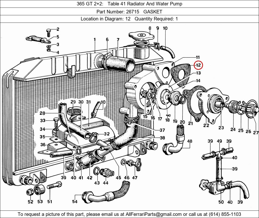 Ferrari Part Number 26715, GASKET shown here as used in 365 GT 2+2 Table 41 Radiator And Water Pump. Location in Diagram: 12. Required Quantity: 1