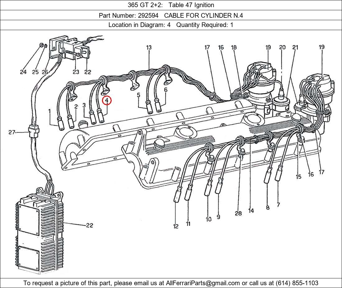 Ferrari Part Number 292594, CABLE FOR CYLINDER N.4 shown here as used in 365 GT 2+2 Table 47 Ignition. Location in Diagram: 4. Required Quantity: 1
