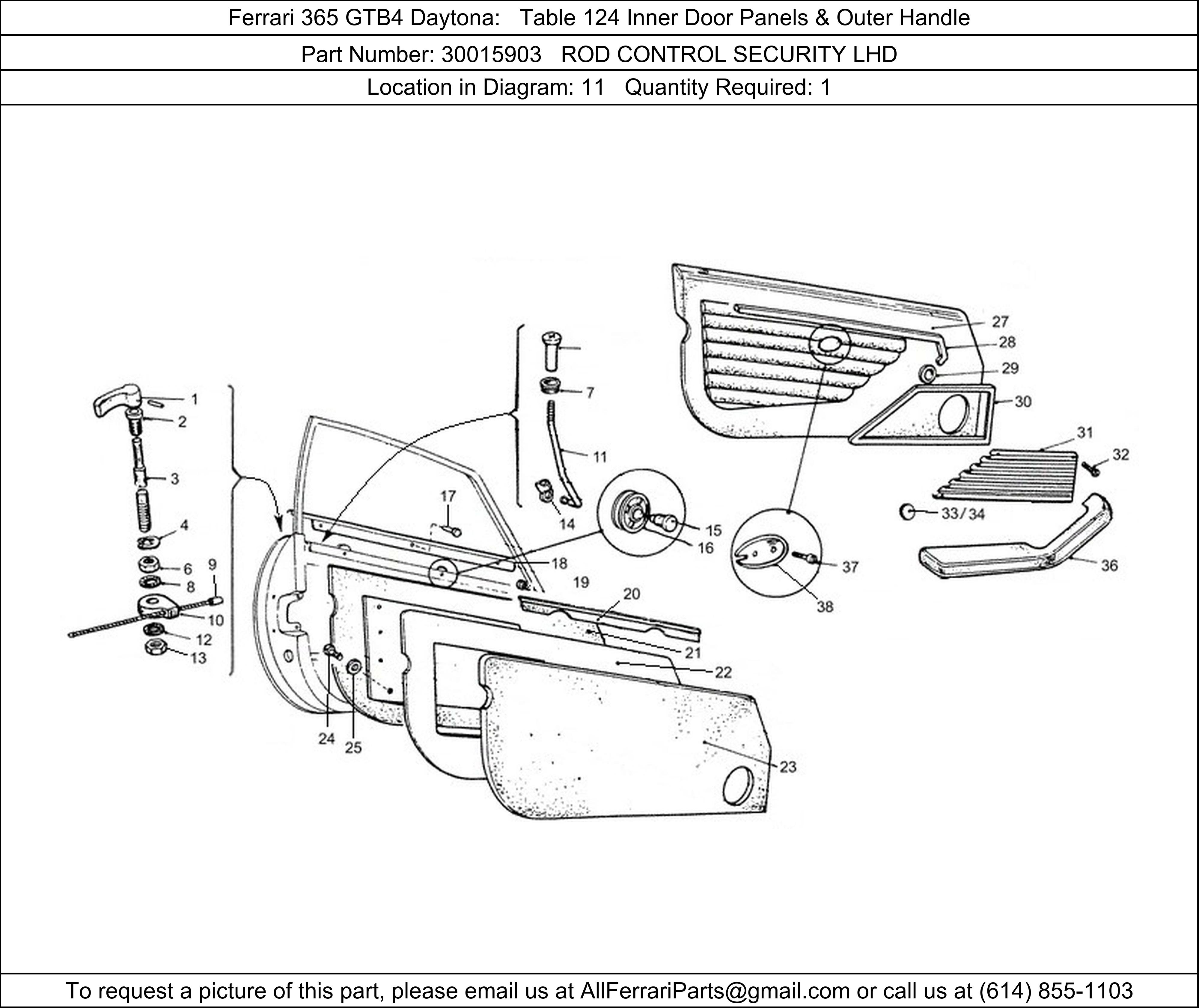 Ferrari Part 30015903, ROD CONTROL SECURITY LHD, shown here as used in Ferrari 365 GTB4 Daytona Table 124 Inner Door Panels & Outer Handle.