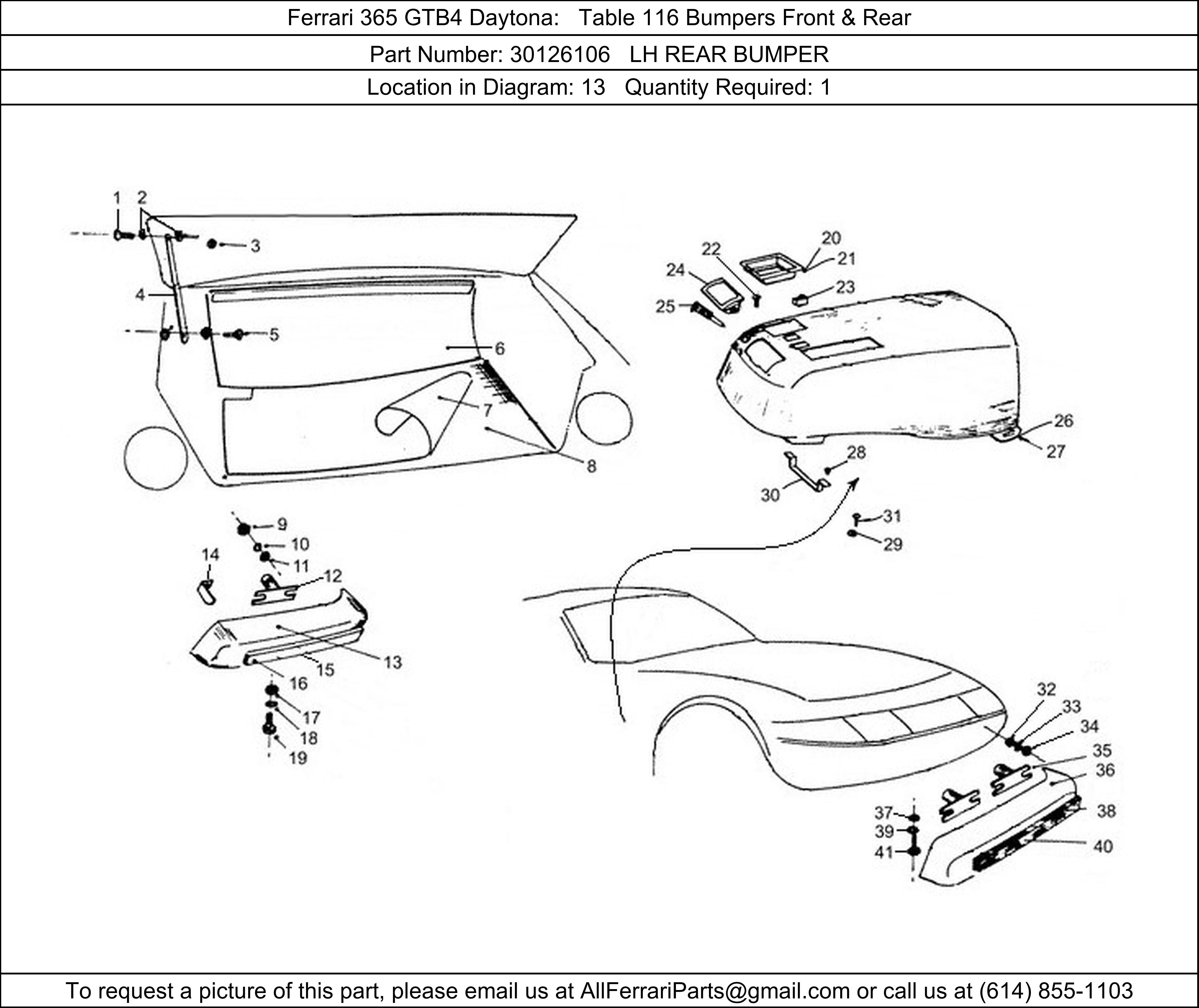Ferrari Part 30126106, LH REAR BUMPER, shown here as used in Ferrari 365 GTB4 Daytona Table 116 Bumpers Front & Rear.