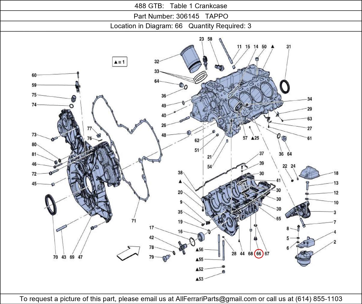Ferrari Part Number 306145, TAPPO shown here as used in 488 GTB Table 1 Crankcase. Location in Diagram: 66. Required Quantity: 3. This Ferrari part is used in more than one diagram. Click on the diagrams below to see alternative uses of this part: