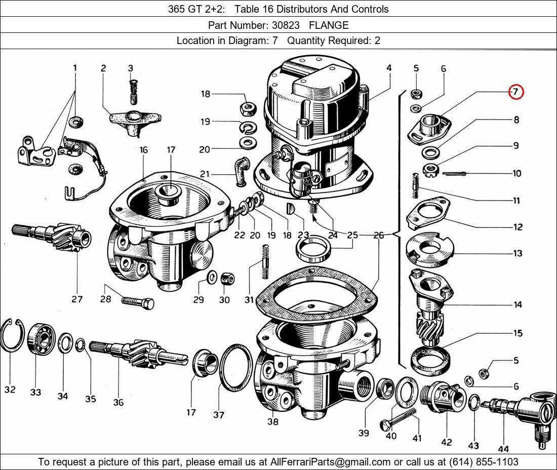 Ferrari Part Number 30823, FLANGE shown here as used in 365 GT 2+2 Table 16 Distributors And Controls. Location in Diagram: 7. Required Quantity: 2. This Ferrari part is used in more than one diagram. Click on the diagrams below to see alternative uses of this part: