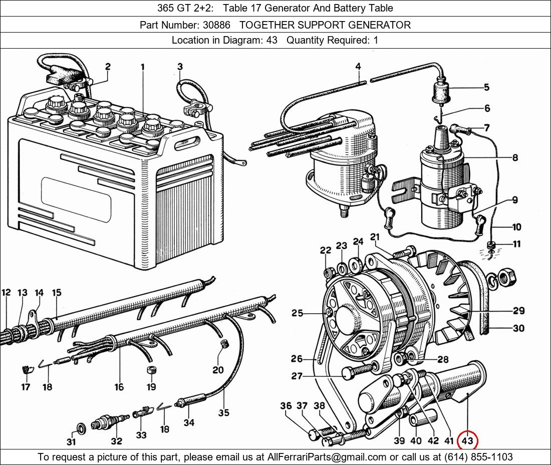 Ferrari Part Number 30886, TOGETHER SUPPORT GENERATOR shown here as used in 365 GT 2+2 Table 17 Generator And Battery Table. Location in Diagram: 43. Required Quantity: 1