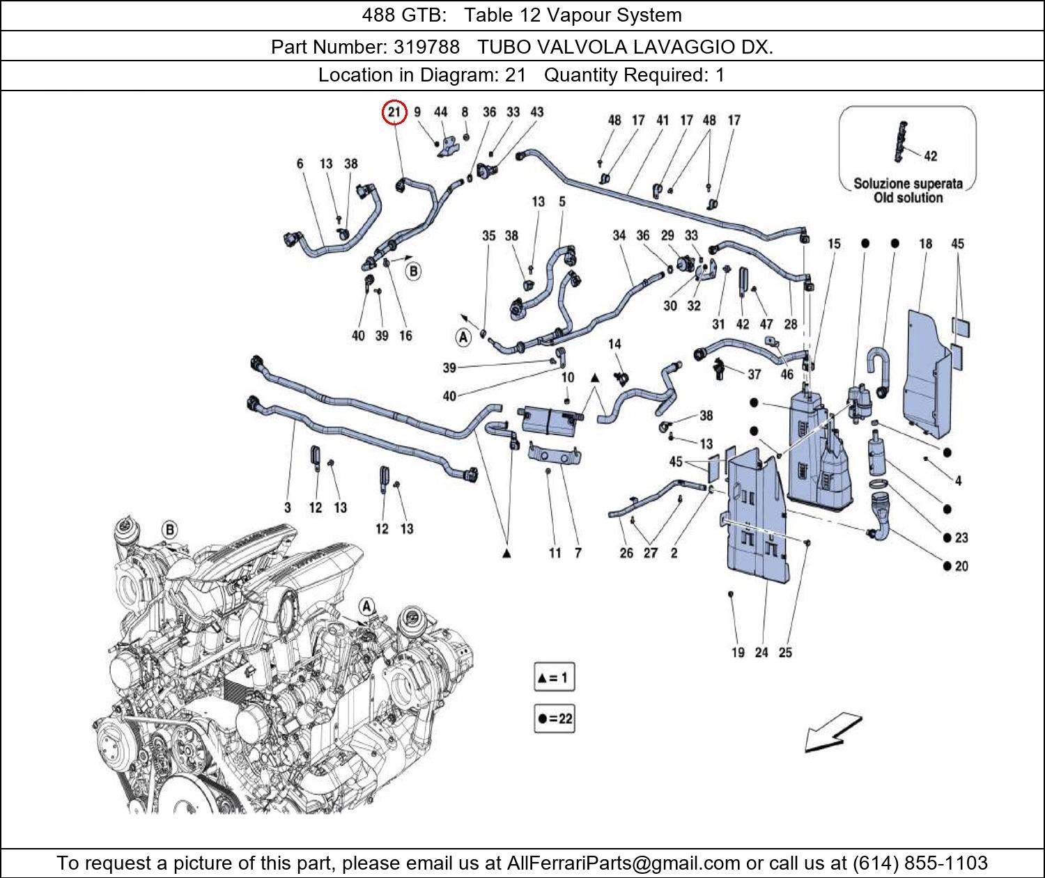 Ferrari Part Number 319788, TUBO VALVOLA LAVAGGIO DX. shown here as used in 488 GTB Table 12 Vapour System. Location in Diagram: 21. Required Quantity: 1. This Ferrari part is used in more than one diagram. Click on the diagrams below to see alternative uses of this part: