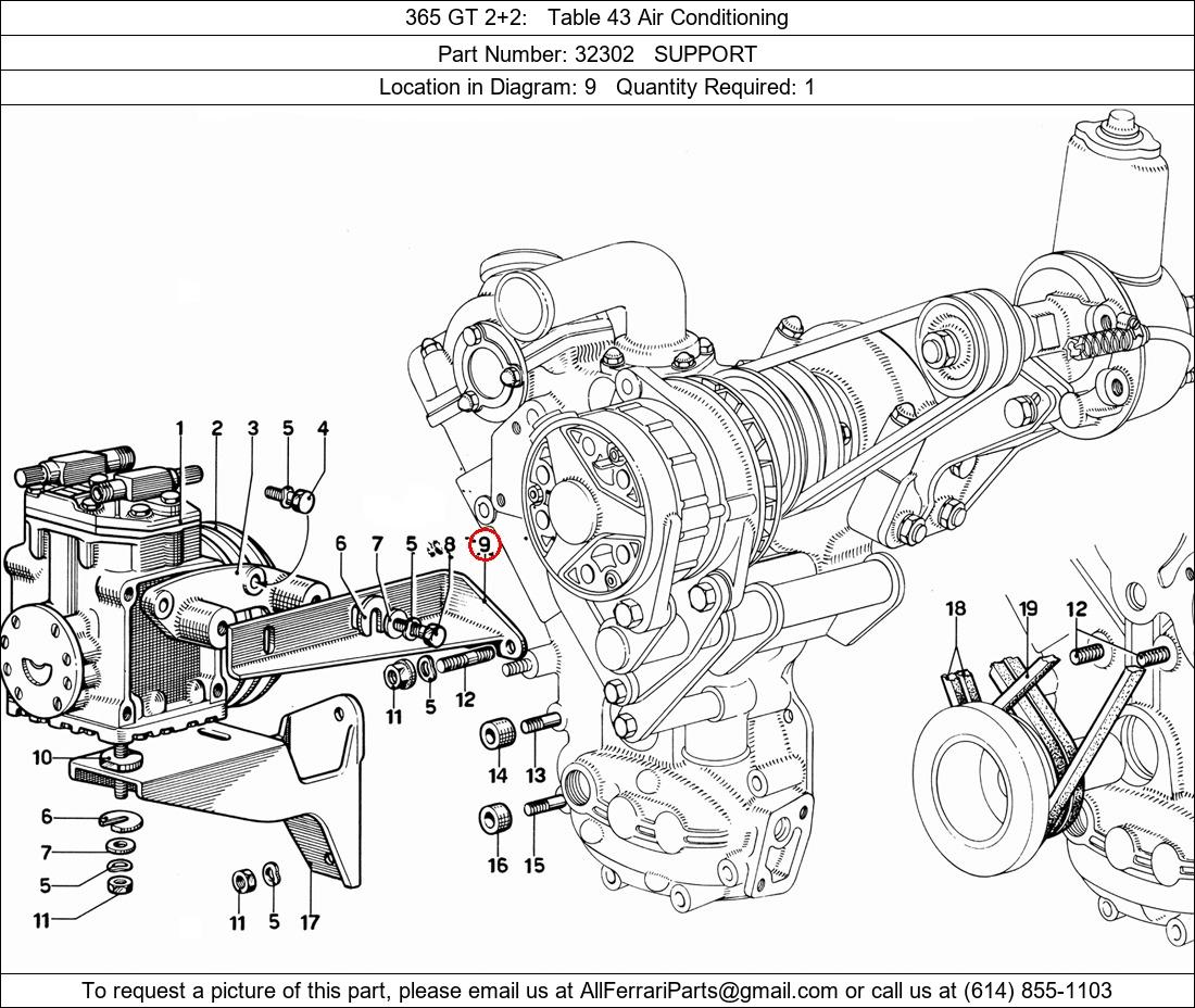 Ferrari Part Number 32302, SUPPORT shown here as used in 365 GT 2+2 Table 43 Air Conditioning. Location in Diagram: 9. Required Quantity: 1. This Ferrari part is used in more than one diagram. Click on the diagrams below to see alternative uses of this part: