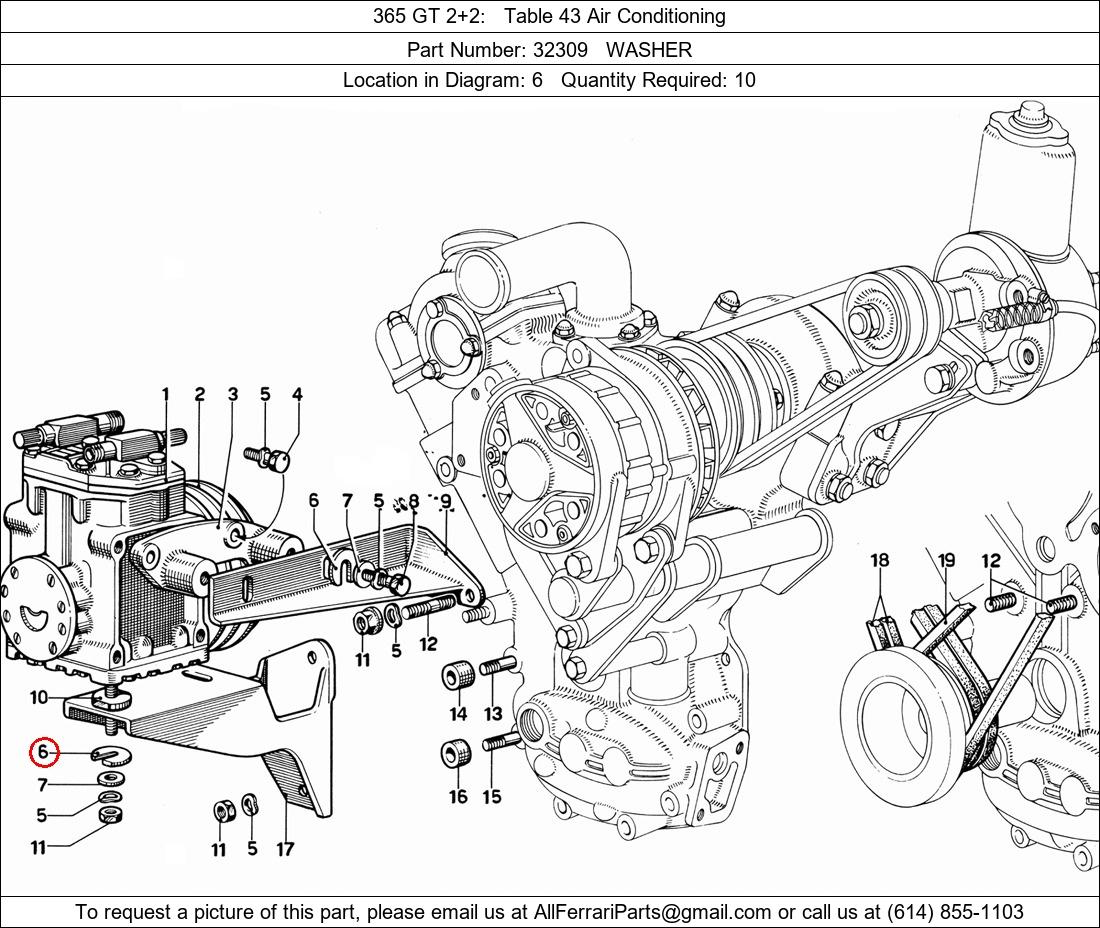 Ferrari Part Number 32309, WASHER shown here as used in 365 GT 2+2 Table 43 Air Conditioning. Location in Diagram: 6. Required Quantity: 10. This Ferrari part is used in more than one diagram. Click on the diagrams below to see alternative uses of this part: