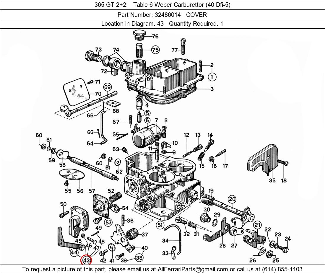 Ferrari Part Number 32486014, COVER shown here as used in 365 GT 2+2 Table 6 Weber Carburettor (40 Dfi-5). Location in Diagram: 43. Required Quantity: 1