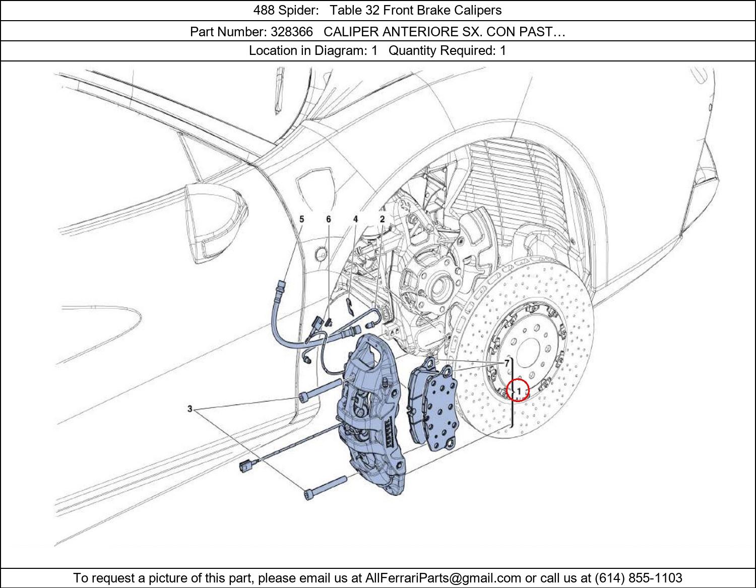 Ferrari Part Number 328366, CALIPER ANTERIORE SX. CON PAST… shown here as used in 488 Spider Table 32 Front Brake Calipers. Location in Diagram: 1. Required Quantity: 1. This Ferrari part is used in more than one diagram. Click on the diagrams below to see alternative uses of this part:
