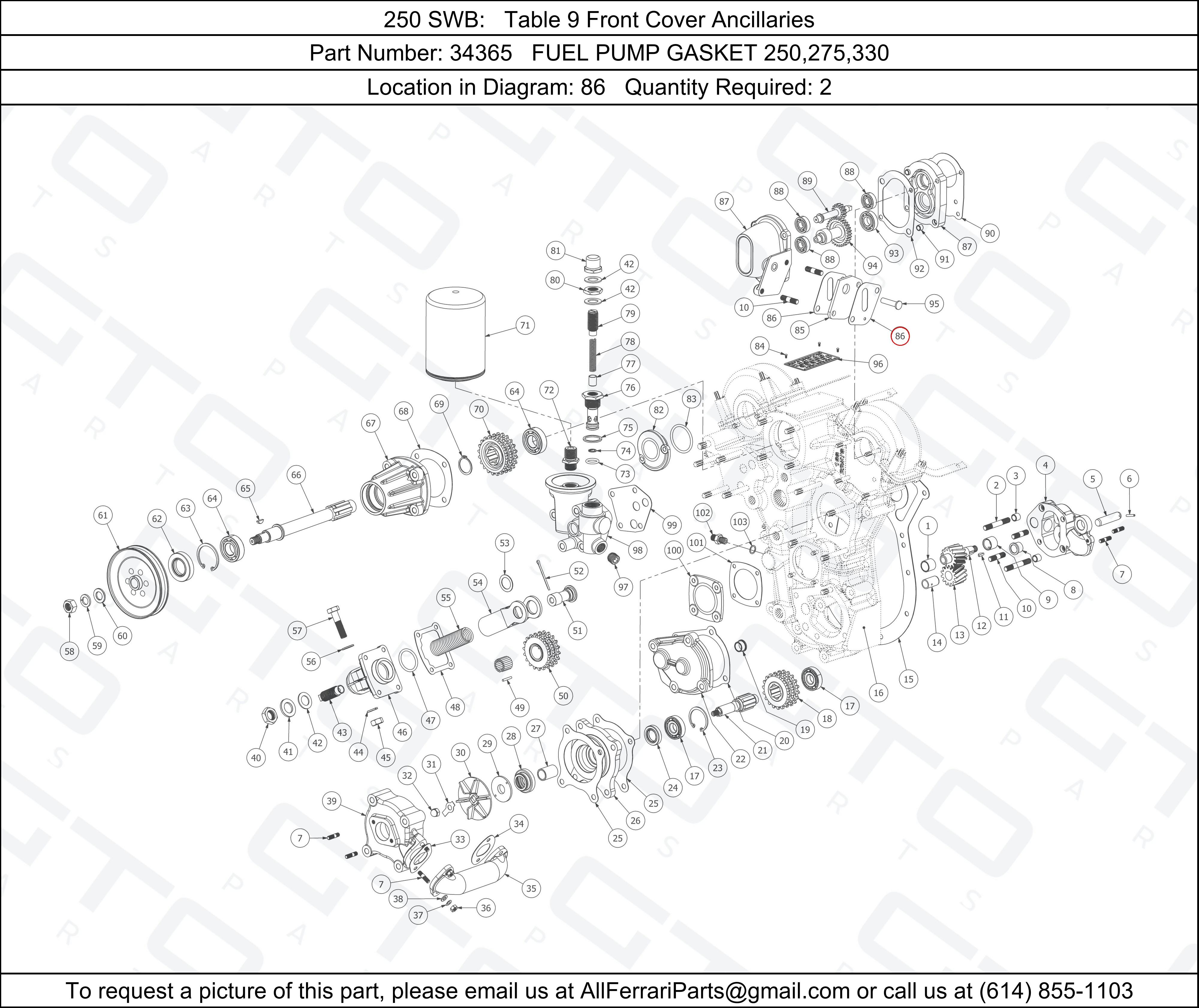 Ferrari Part Number 34365, FUEL PUMP GASKET 250,275,330 shown here as used in 250 SWB Table 9 Front Cover Ancillaries. Location in Diagram: 86. Required Quantity: 2. This Ferrari part is used in more than one diagram. Click on the diagrams below to see alternative uses of this part: