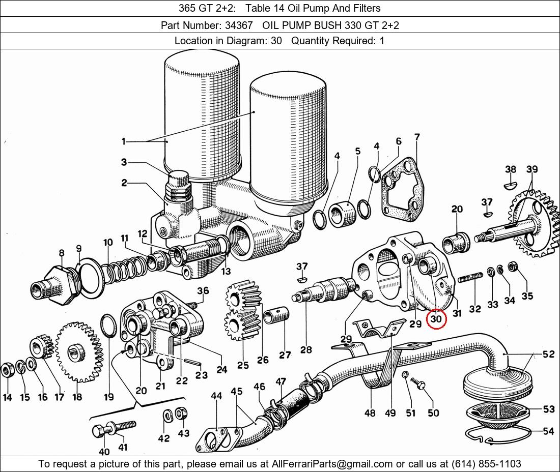 Ferrari Part Number 34367, OIL PUMP BUSH 330 GT 2+2 shown here as used in 365 GT 2+2 Table 14 Oil Pump And Filters. Location in Diagram: 30. Required Quantity: 1. This Ferrari part is used in more than one diagram. Click on the diagrams below to see alternative uses of this part: