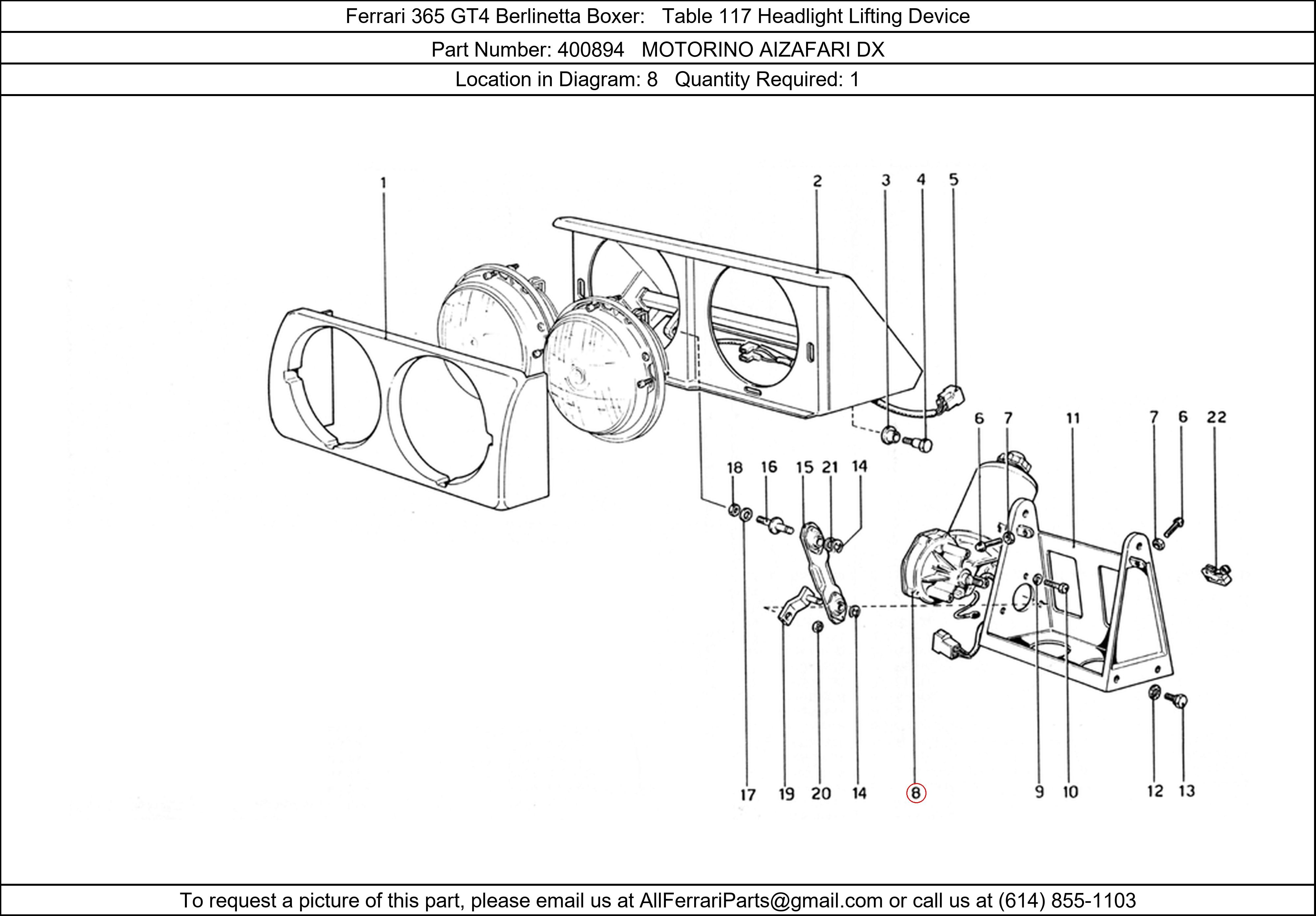 Ferrari Part Number 400894, MOTORINO AIZAFARI DX shown here as used in Ferrari 365 GT4 Berlinetta Boxer Table 117 Headlight Lifting Device. Location in Diagram: 8. Required Quantity: 1