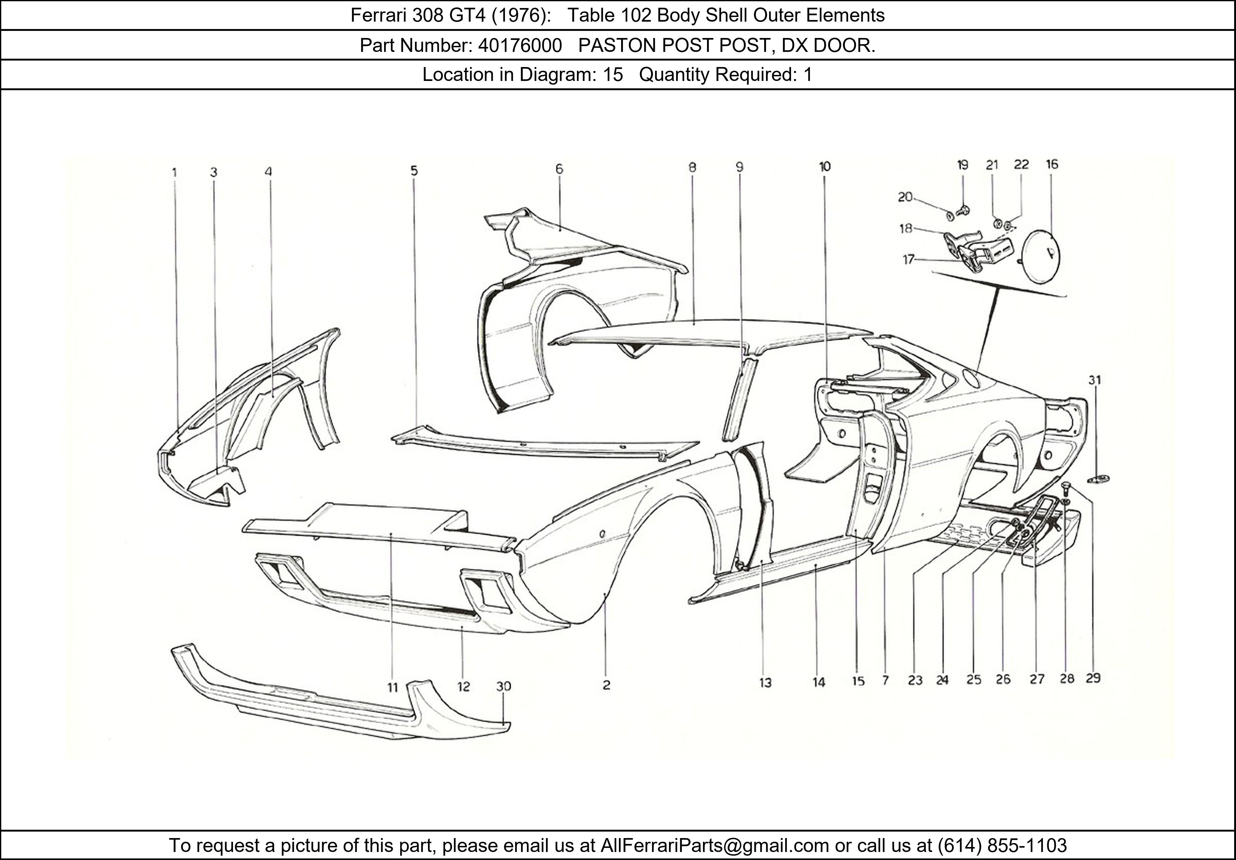 Ferrari Part 40176000, PASTON POST POST, DX DOOR., shown here as used in Ferrari 308 GT4 (1976) Table 102 Body Shell Outer Elements. Other uses of this part are shown below: