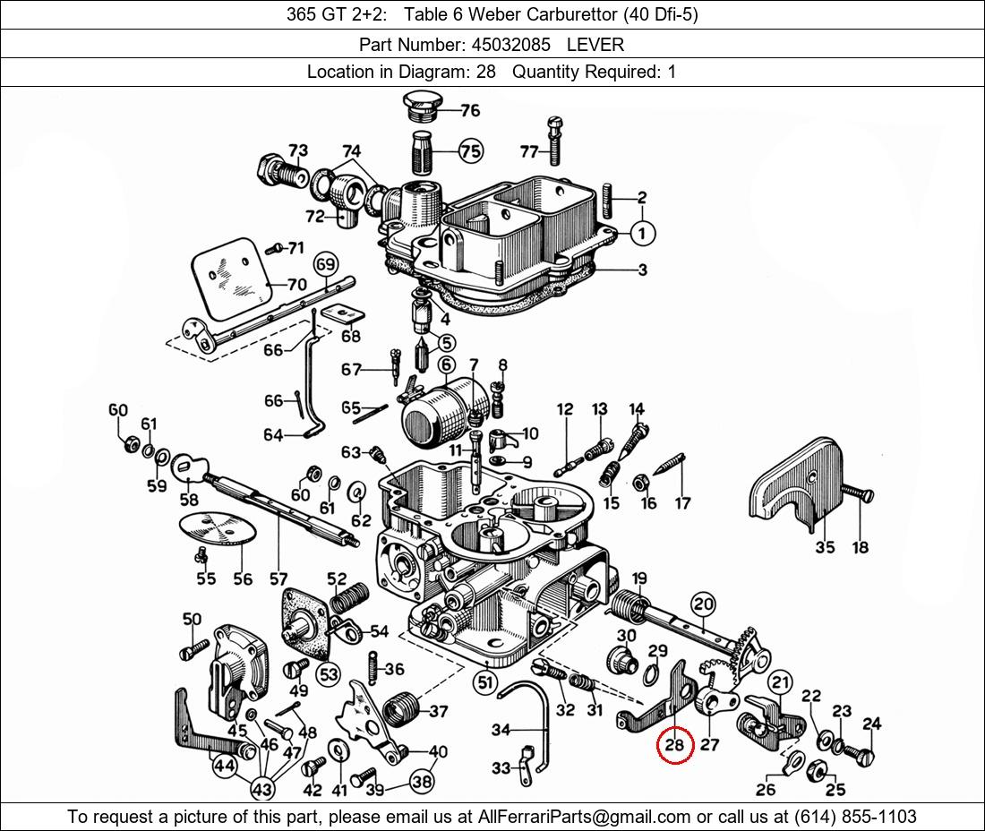 Ferrari Part Number 45032085, LEVER shown here as used in 365 GT 2+2 Table 6 Weber Carburettor (40 Dfi-5). Location in Diagram: 28. Required Quantity: 1