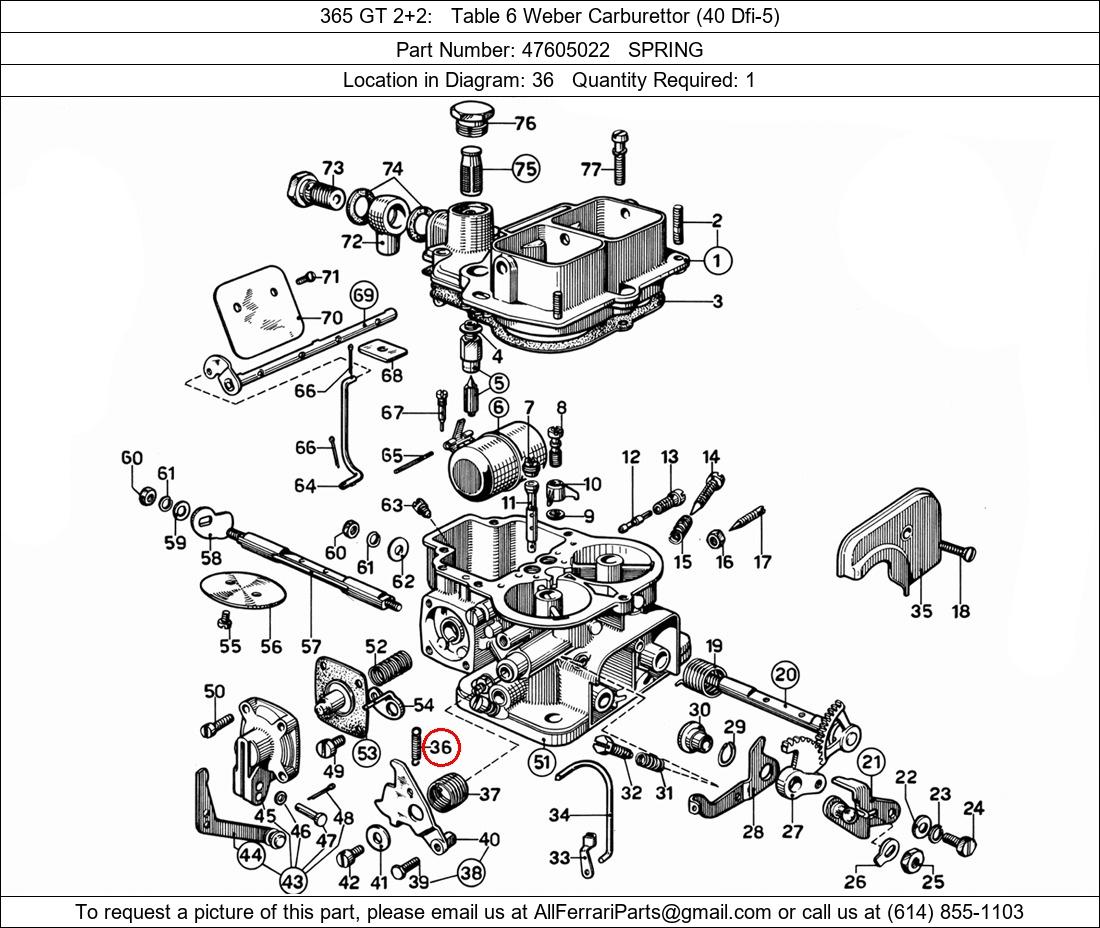 Ferrari Part Number 47605022, SPRING shown here as used in 365 GT 2+2 Table 6 Weber Carburettor (40 Dfi-5). Location in Diagram: 36. Required Quantity: 1