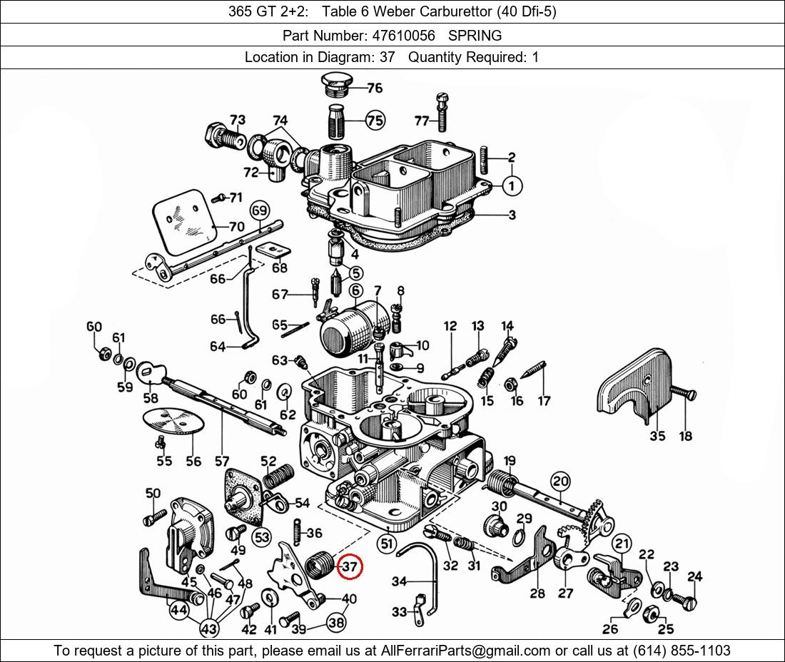 Ferrari Part Number 47610056, SPRING shown here as used in 365 GT 2+2 Table 6 Weber Carburettor (40 Dfi-5). Location in Diagram: 37. Required Quantity: 1
