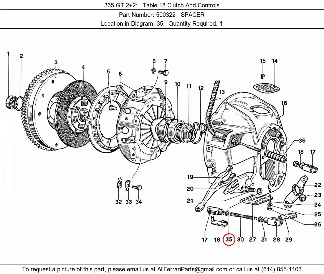 Ferrari Part Number 500322, SPACER shown here as used in 365 GT 2+2 Table 18 Clutch And Controls. Location in Diagram: 35. Required Quantity: 1. This Ferrari part is used in more than one diagram. Click on the diagrams below to see alternative uses of this part: