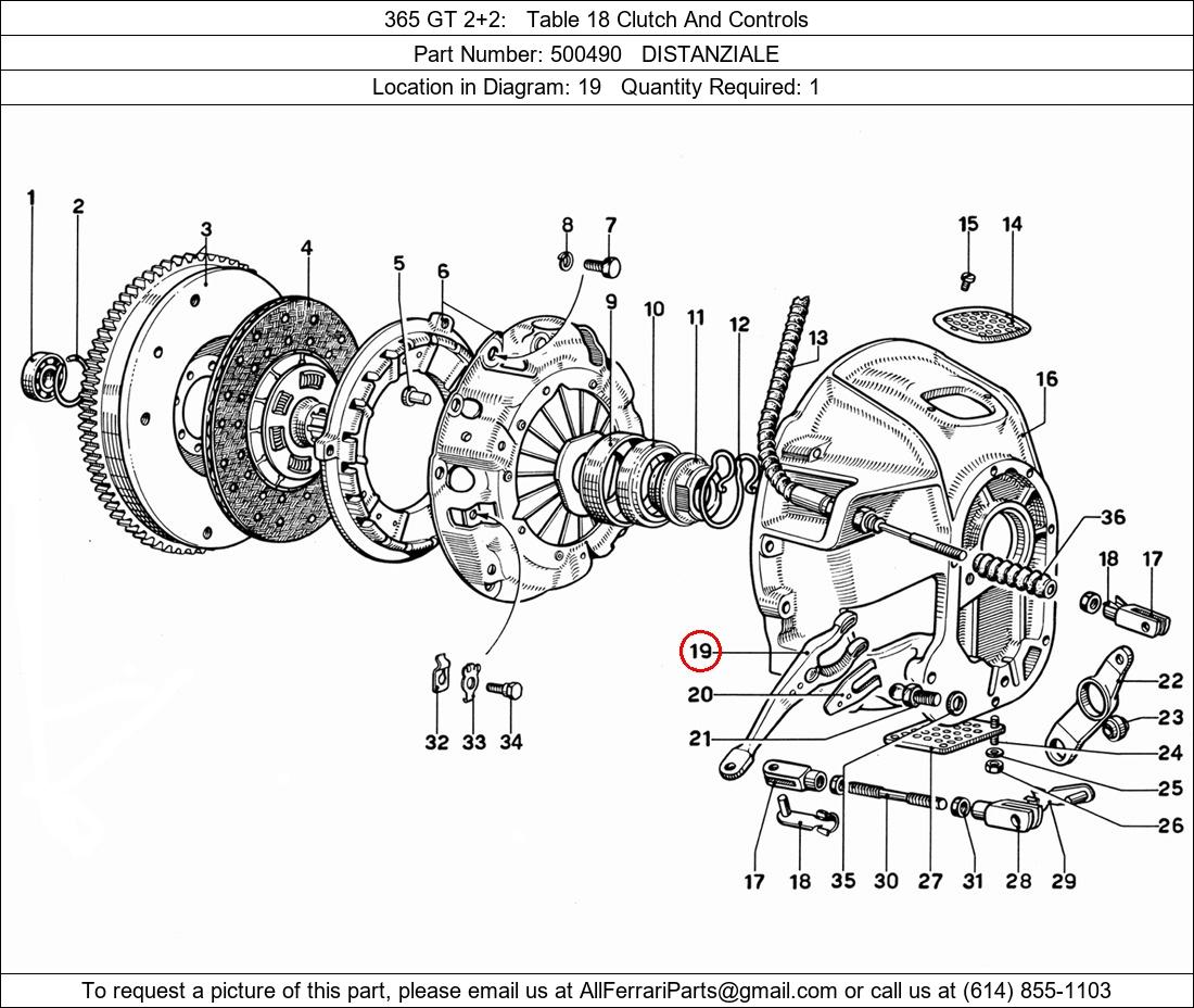 Ferrari Part Number 500490, DISTANZIALE shown here as used in 365 GT 2+2 Table 18 Clutch And Controls. Location in Diagram: 19. Required Quantity: 1. This Ferrari part is used in more than one diagram. Click on the diagrams below to see alternative uses of this part: