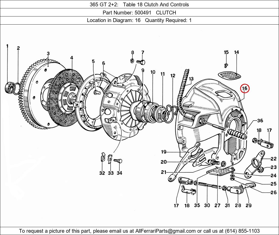 Ferrari Part Number 500491, CLUTCH shown here as used in 365 GT 2+2 Table 18 Clutch And Controls. Location in Diagram: 16. Required Quantity: 1