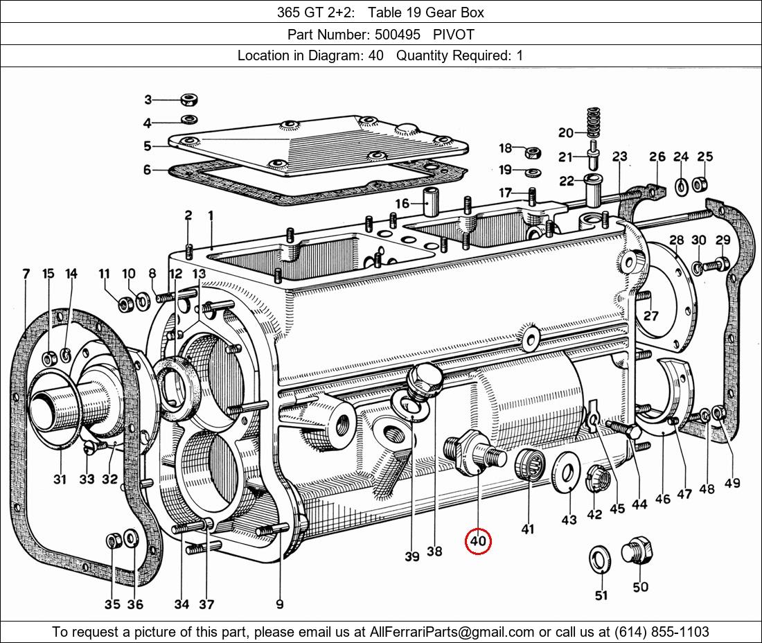 Ferrari Part Number 500495, PIVOT shown here as used in 365 GT 2+2 Table 19 Gear Box. Location in Diagram: 40. Required Quantity: 1. This Ferrari part is used in more than one diagram. Click on the diagrams below to see alternative uses of this part: