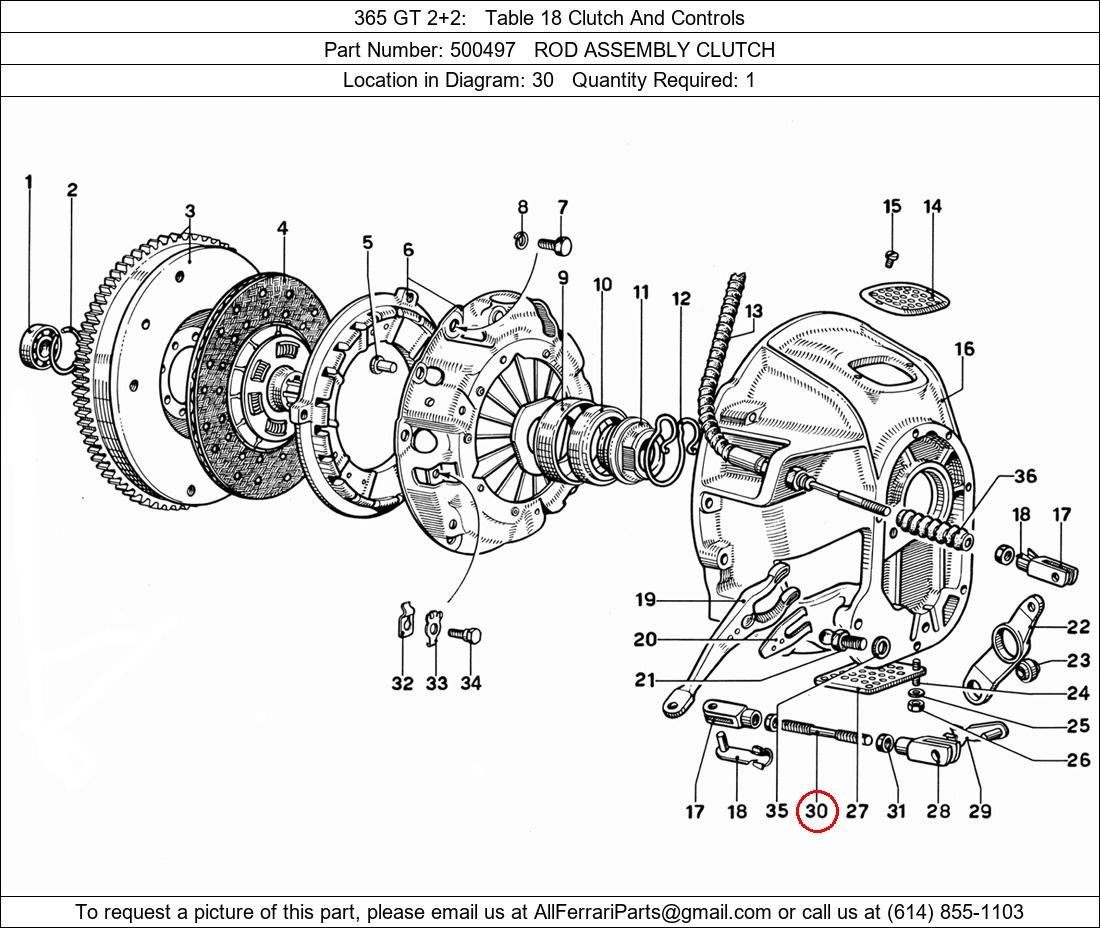 Ferrari Part Number 500497, ROD ASSEMBLY CLUTCH shown here as used in 365 GT 2+2 Table 18 Clutch And Controls. Location in Diagram: 30. Required Quantity: 1