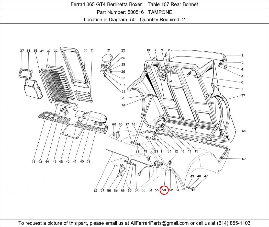 Ferrari Part Number 500516, TAMPONE shown here as used in Ferrari 365 GT4 Berlinetta Boxer Table 107 Rear Bonnet. Location in Diagram: 50. Required Quantity: 2. This Ferrari part is used in more than one diagram. Click on the diagrams below to see alternative uses of this part: