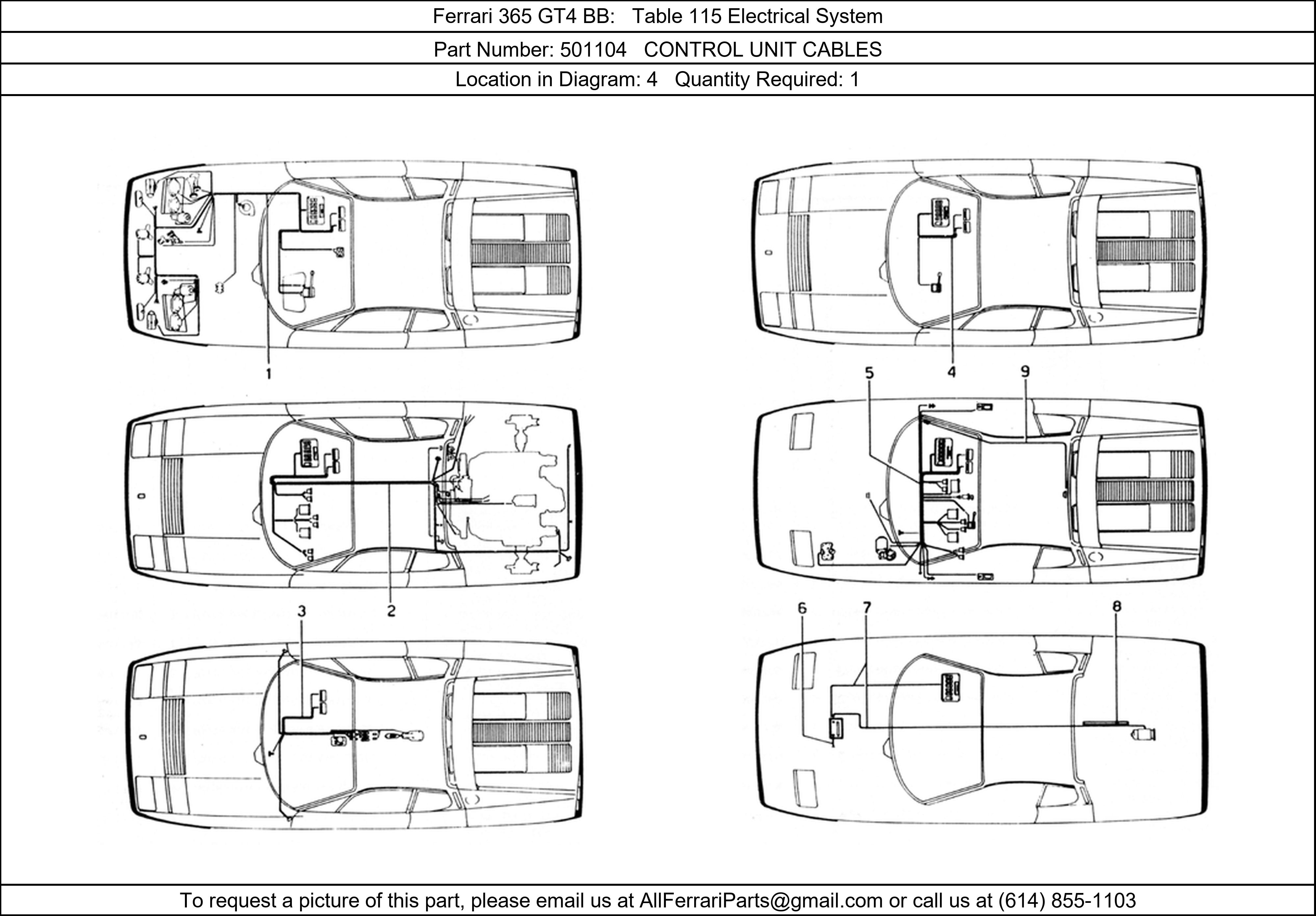 Ferrari Part 501104, CONTROL UNIT CABLES, shown here as used in Ferrari 365 GT4 BB Table 115 Electrical System.