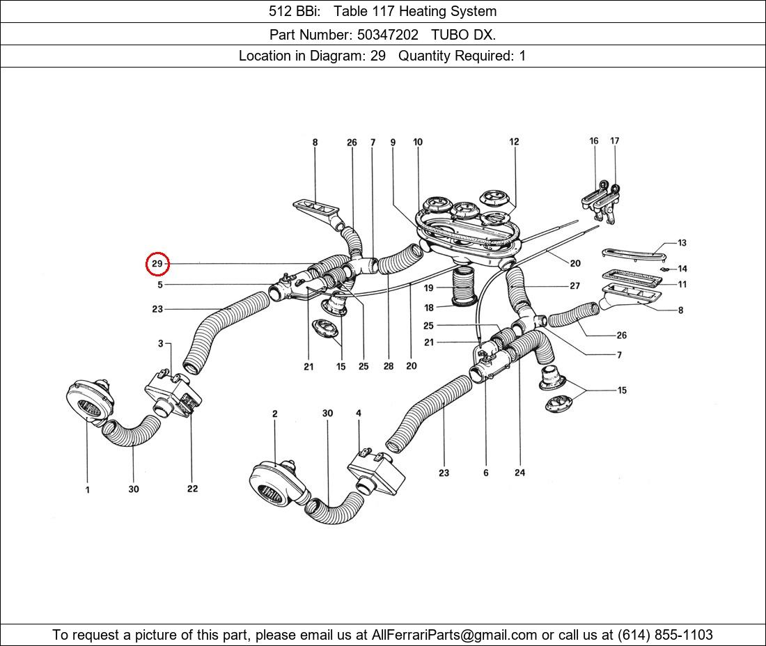 Ferrari Part Number 50347202, TUBO DX. shown here as used in 512 BBi Table 117 Heating System. Location in Diagram: 29. Required Quantity: 1. This Ferrari part is used in more than one diagram. Click on the diagrams below to see alternative uses of this part:
