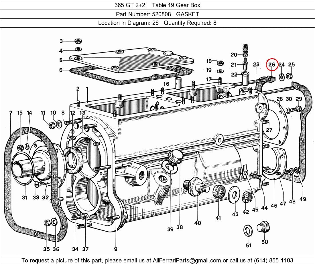 Ferrari Part Number 520808, GASKET shown here as used in 365 GT 2+2 Table 19 Gear Box. Location in Diagram: 26. Required Quantity: 8