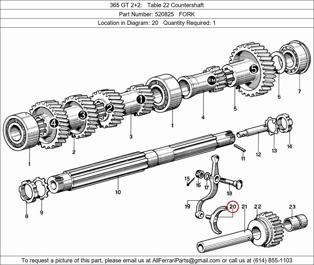 Ferrari Part Number 520825, FORK shown here as used in 365 GT 2+2 Table 22 Countershaft. Location in Diagram: 20. Required Quantity: 1