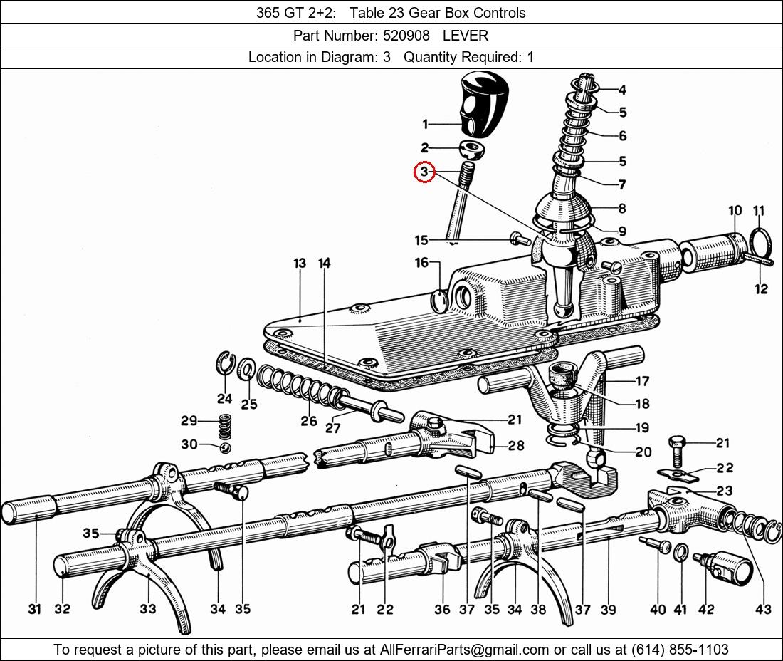 Ferrari Part Number 520908, LEVER shown here as used in 365 GT 2+2 Table 23 Gear Box Controls. Location in Diagram: 3. Required Quantity: 1