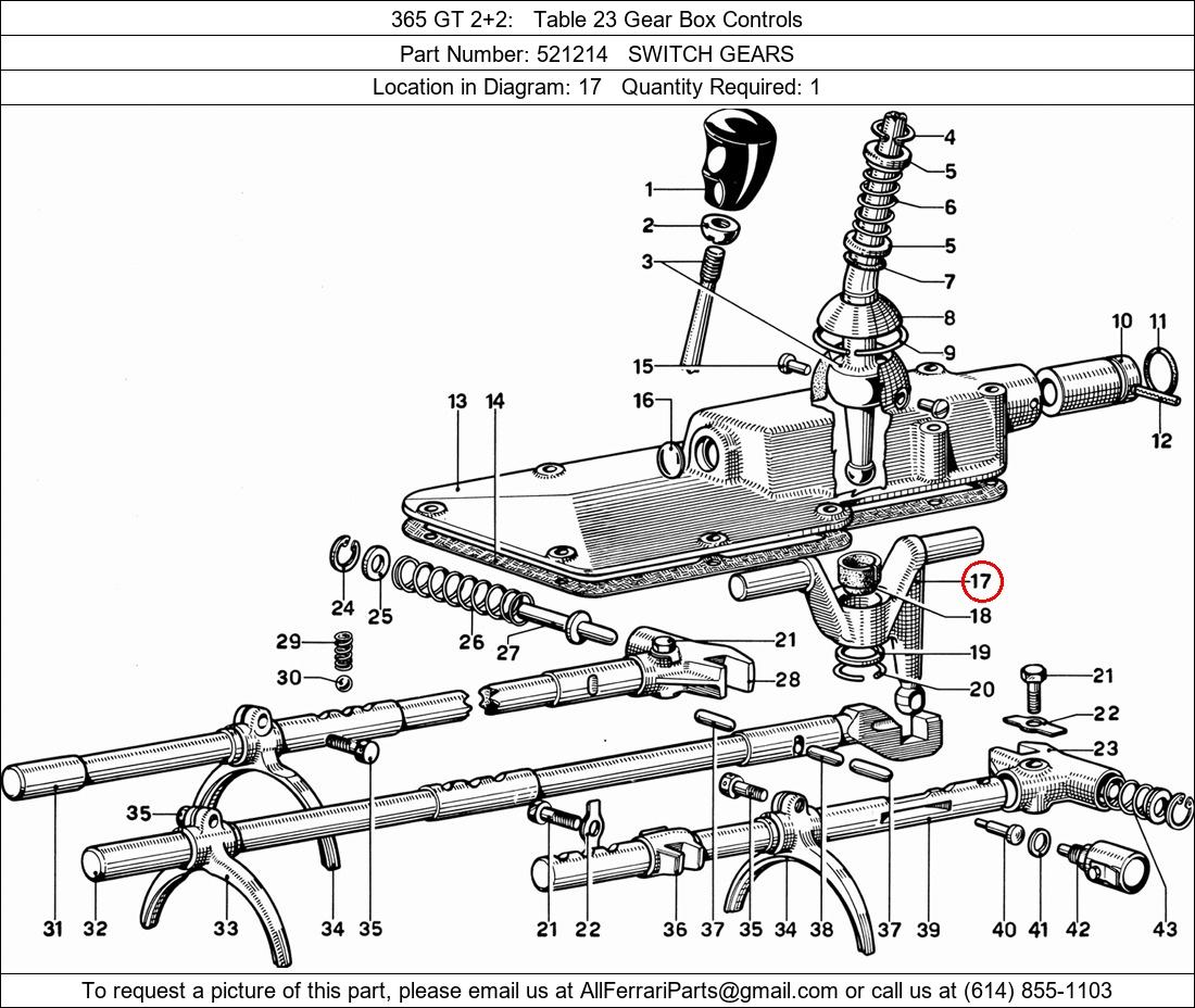 Ferrari Part Number 521214, SWITCH GEARS shown here as used in 365 GT 2+2 Table 23 Gear Box Controls. Location in Diagram: 17. Required Quantity: 1