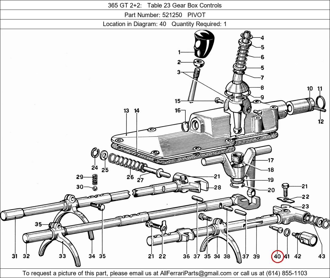Ferrari Part Number 521250, PIVOT shown here as used in 365 GT 2+2 Table 23 Gear Box Controls. Location in Diagram: 40. Required Quantity: 1