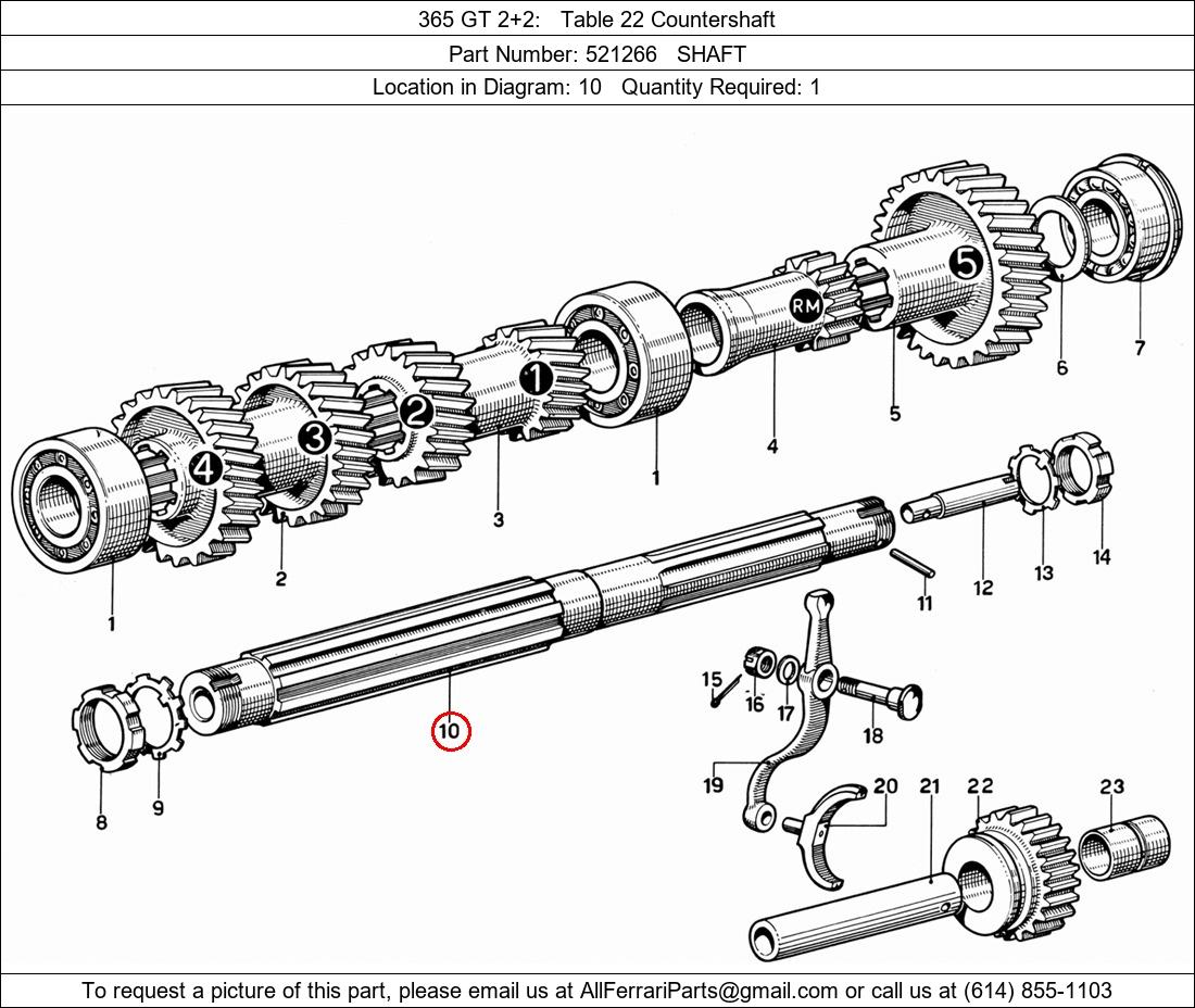 Ferrari Part Number 521266, SHAFT shown here as used in 365 GT 2+2 Table 22 Countershaft. Location in Diagram: 10. Required Quantity: 1