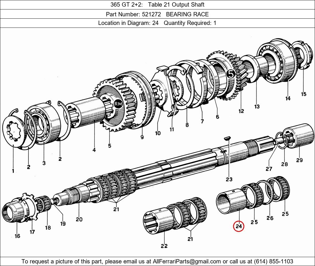 Ferrari Part Number 521272, BEARING RACE shown here as used in 365 GT 2+2 Table 21 Output Shaft. Location in Diagram: 24. Required Quantity: 1