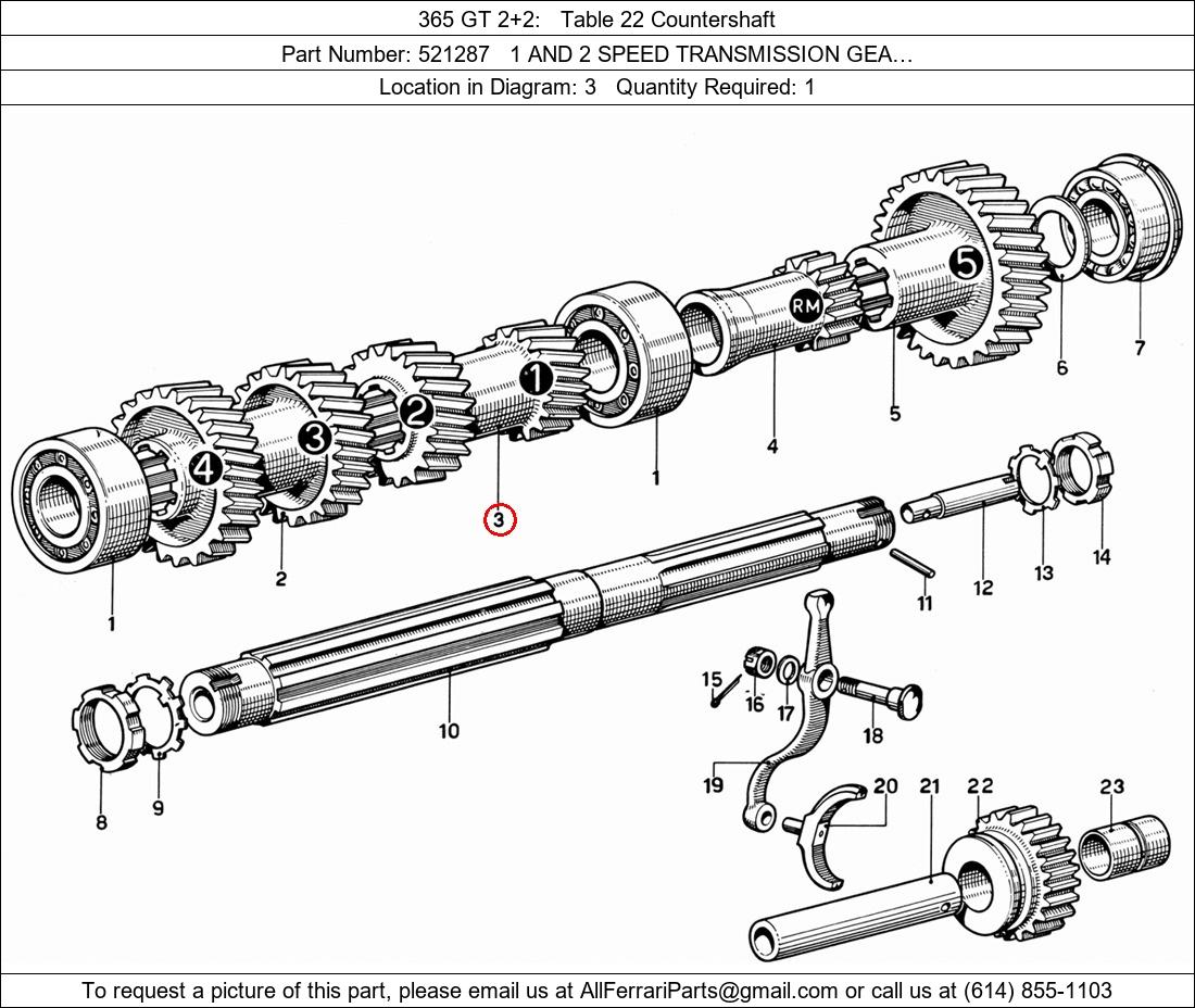 Ferrari Part Number 521287, 1 AND 2 SPEED TRANSMISSION GEA… shown here as used in 365 GT 2+2 Table 22 Countershaft. Location in Diagram: 3. Required Quantity: 1