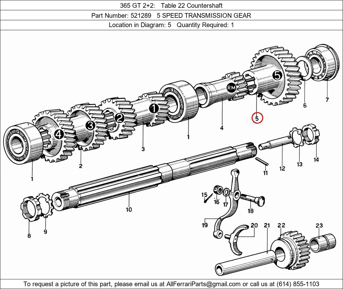 Ferrari Part Number 521289, 5 SPEED TRANSMISSION GEAR shown here as used in 365 GT 2+2 Table 22 Countershaft. Location in Diagram: 5. Required Quantity: 1