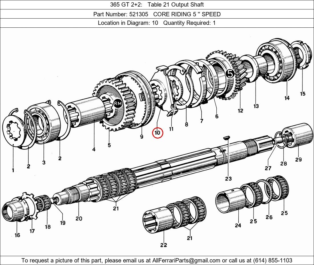 Ferrari Part Number 521305, CORE RIDING 5 '' SPEED shown here as used in 365 GT 2+2 Table 21 Output Shaft. Location in Diagram: 10. Required Quantity: 1