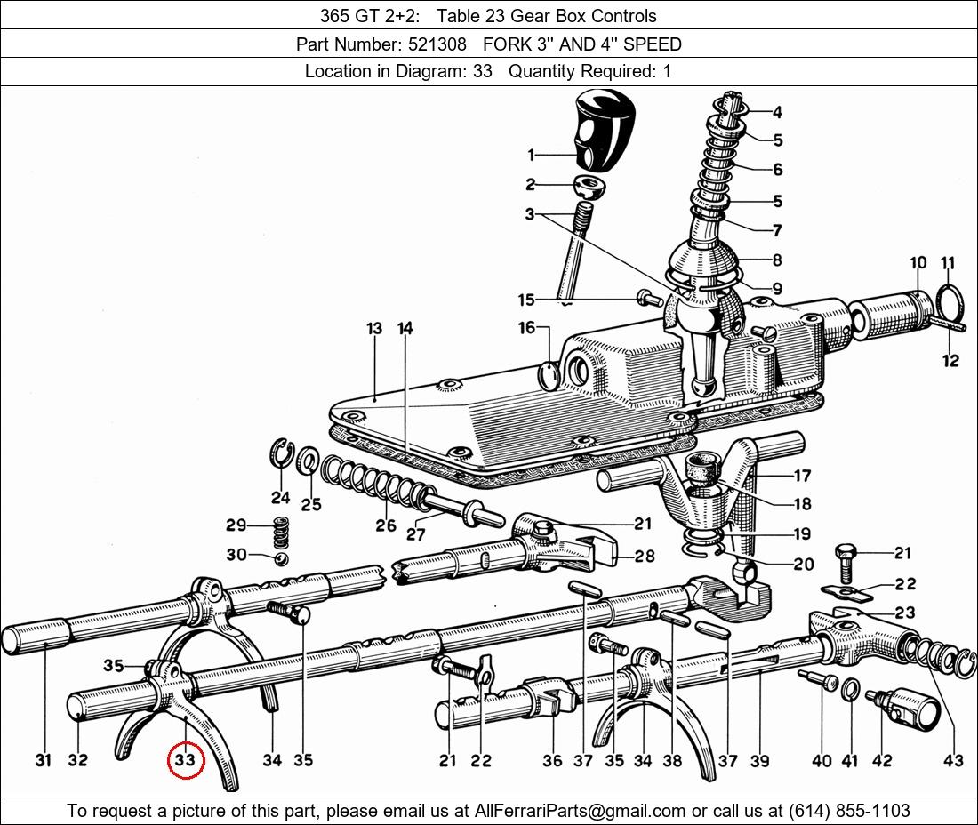 Ferrari Part Number 521308, FORK 3'' AND 4'' SPEED shown here as used in 365 GT 2+2 Table 23 Gear Box Controls. Location in Diagram: 33. Required Quantity: 1