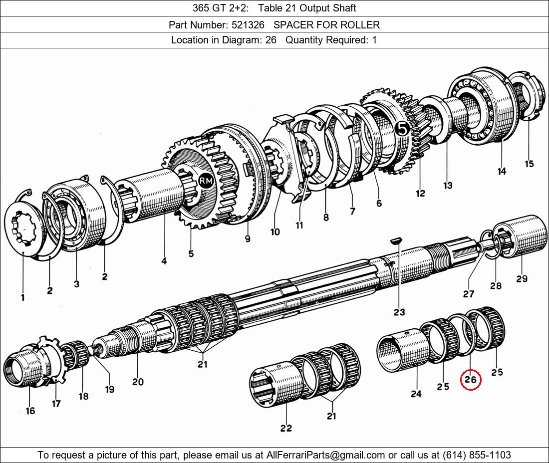 Ferrari Part Number 521326, SPACER FOR ROLLER shown here as used in 365 GT 2+2 Table 21 Output Shaft. Location in Diagram: 26. Required Quantity: 1