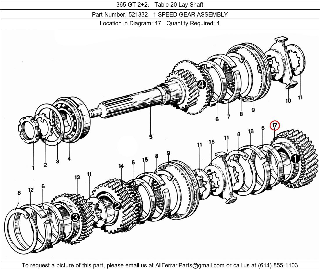 Ferrari Part Number 521332, 1 SPEED GEAR ASSEMBLY shown here as used in 365 GT 2+2 Table 20 Lay Shaft. Location in Diagram: 17. Required Quantity: 1