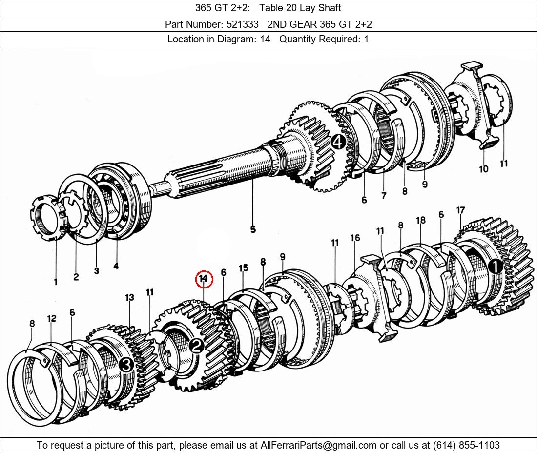 Ferrari Part Number 521333, 2ND GEAR 365 GT 2+2 shown here as used in 365 GT 2+2 Table 20 Lay Shaft. Location in Diagram: 14. Required Quantity: 1