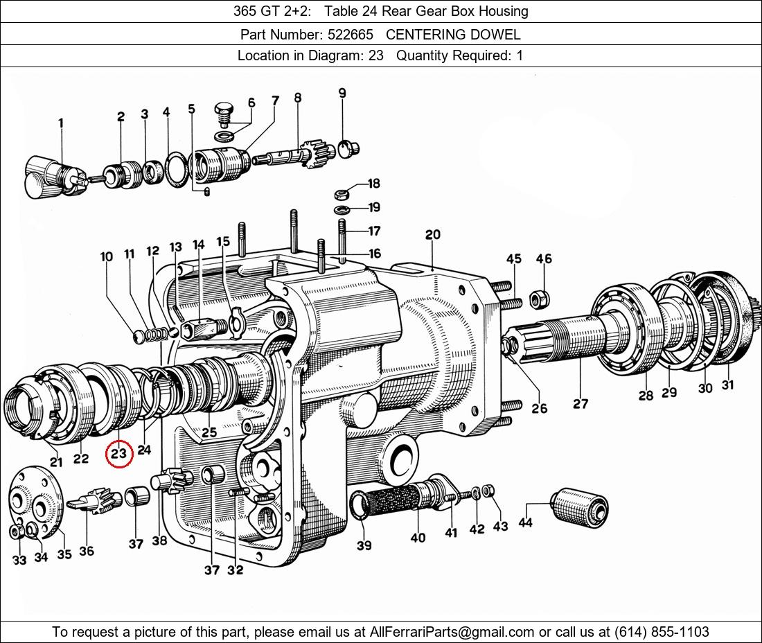 Ferrari Part Number 522665, CENTERING DOWEL shown here as used in 365 GT 2+2 Table 24 Rear Gear Box Housing. Location in Diagram: 23. Required Quantity: 1
